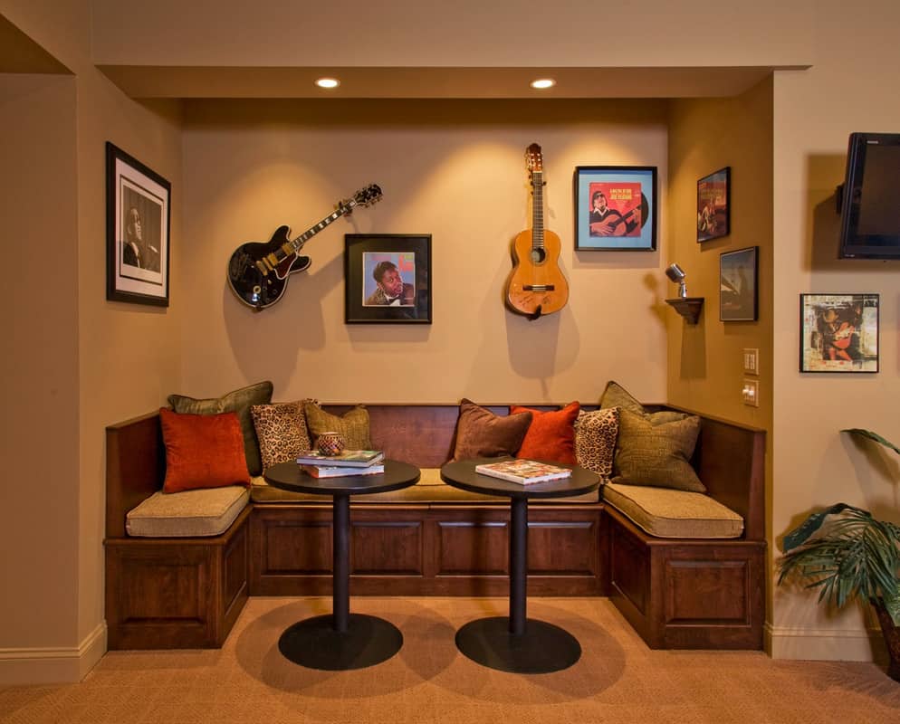 A renovated lower level is often a place to showcase hobbies and interests. This renovation of an existing finished basement had lots of interesting nooks and crannies to display the client’s interests that we highlighted with accent lighting. One area was ideal for a dartboard, while the banquette seating area was the perfect place to display a collection of signed musical instruments and music memorabilia. As lower levels typically contain mechanical systems, in order to keep the ceilings as high as possible, it was necessary to get creative in hiding mechanical, heating, and AC ducts. This often necessitates building a dedicated room that is creatively integrated into the rest of the space, which we were able to do seamlessly in this home.